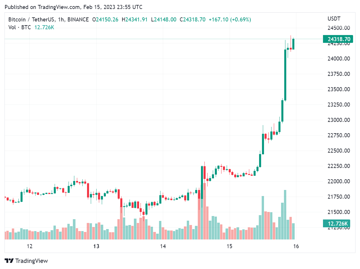 Kurs Bitcoina po raz kolejny gwałtownie wystrzelił na północ. W porównaniu z sytuacją sprzed 24 godzin, wartość pierwotnej kryptowaluty jest wyższa o 9%. W momencie pisania tego artykułu utrzymuje się na poziomie 24 318 USD. Pewnie zastanawiasz się co się wydarzyło? Już wyjaśniamy.