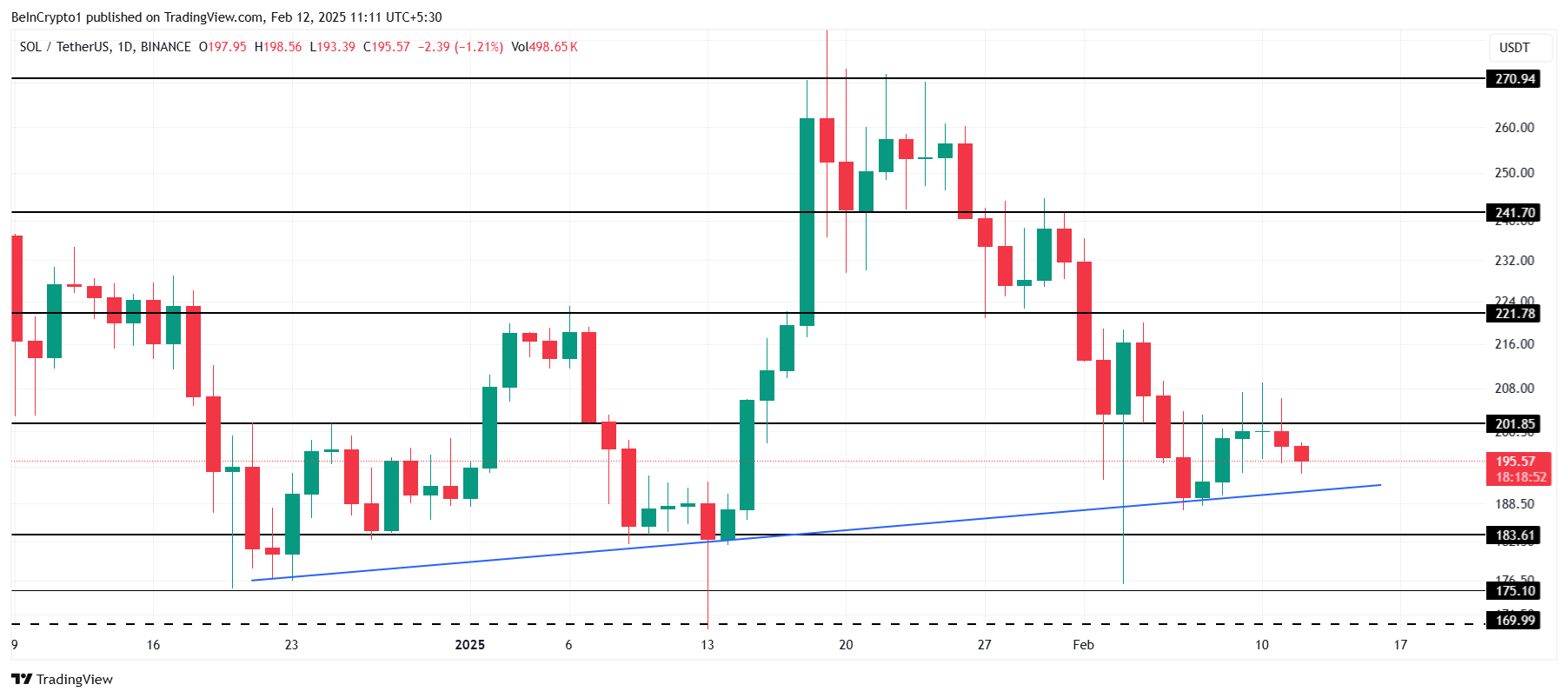 Solana obecnie handluje na poziomie 195 USD, utrzymując się powyżej kluczowego wsparcia na poziomie 183 USD. Dodatkowo altcoin utrzymuje linię trendu wzrostowego, która trwa już ponad półtora miesiąca. To sugeruje, że perspektywy makroekonomiczne pozostają pozytywne, a rynek przygotowuje się na potencjalne odbicie.