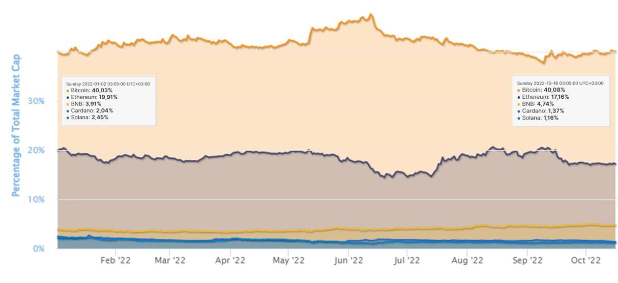 Spójrzmy na wykres udziałów rynkowych głównych kryptowalut według CoinMarketCap od początku roku. Wyłączmy z niego stablecoiny.