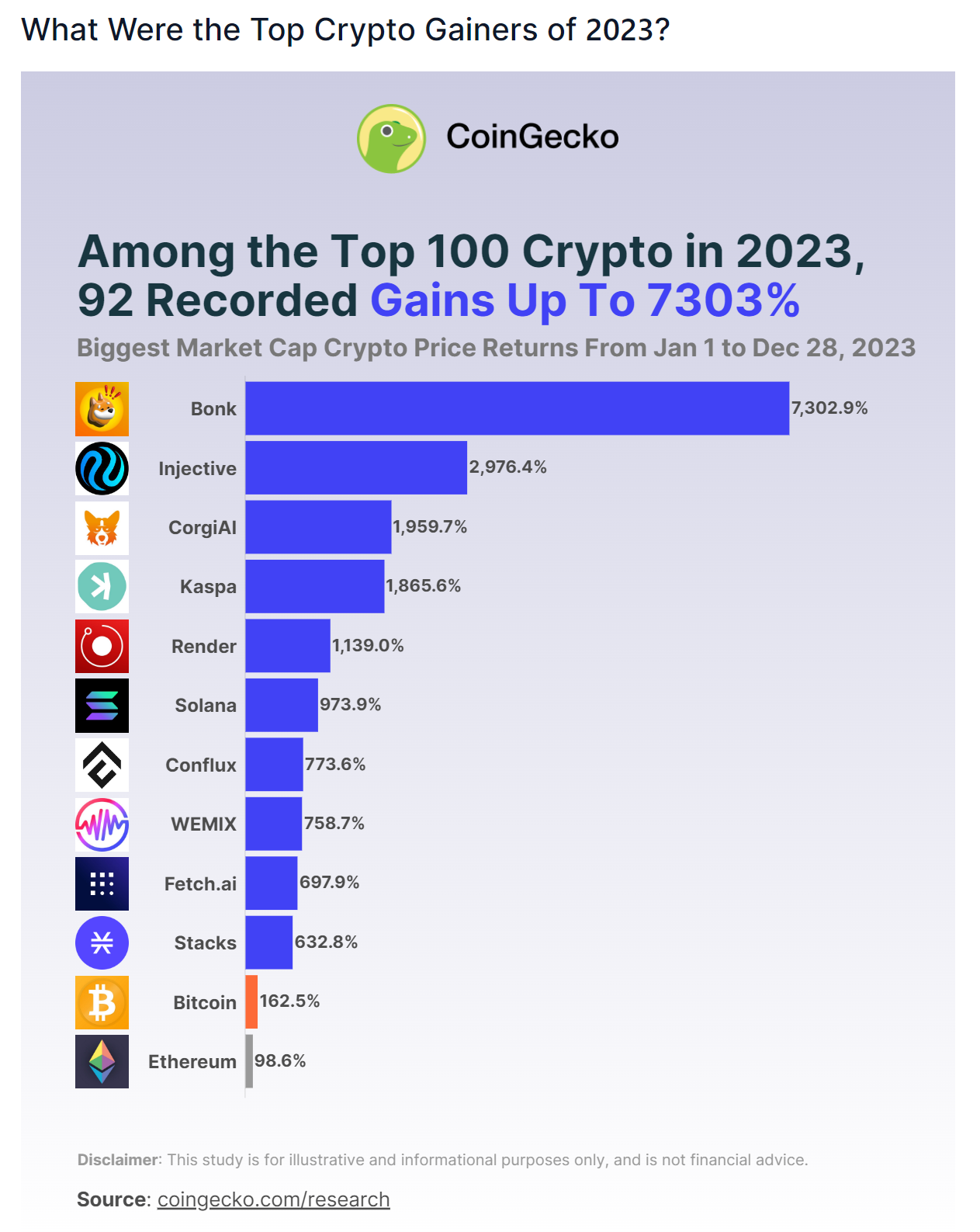 Na drugim miejscu pod względem wzrostu cen znalazła się kryptowaluta Injective, a na trzecim CorgiAI. Osiem ze 100 najlepszych kryptowalut odnotowało spadki cen w 2023 roku. W grupie tej znalazły się Tether (USDT), USDC, Dai, BUSD, TrueUSD, Toncoin, Chiliz i Sui. Analitycy z CoinGecko twierdzą, że dziesięć największych firm kryptowalutowych osiągnęło w ubiegłym roku stopę zwrotu od 632,8% do 7302,9%.