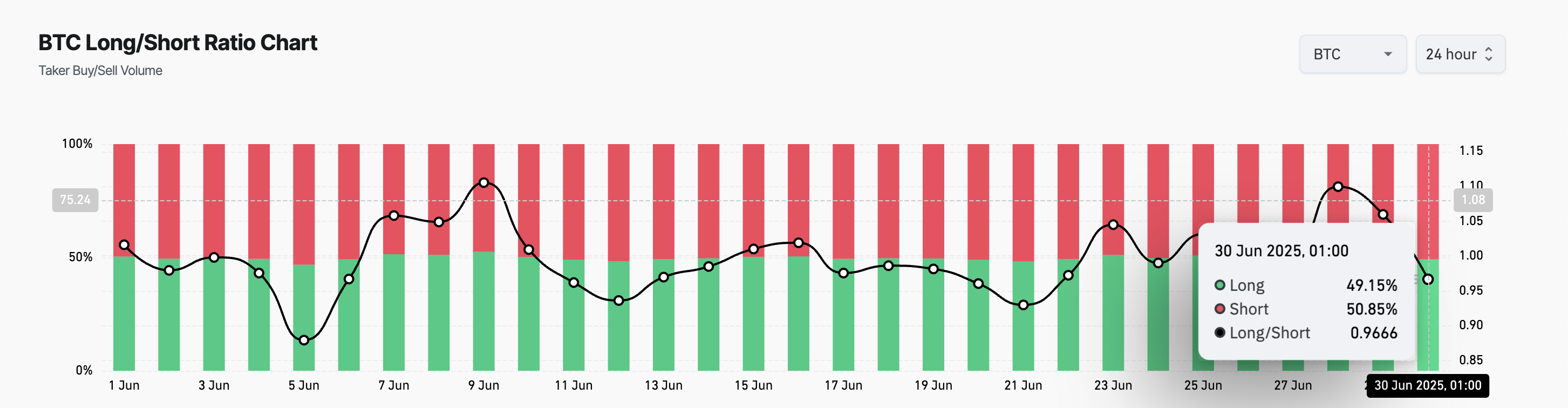 Natomiast, jak w przypadku BTC, wskaźnik poniżej jednego wskazuje, że większość traderów pozycjonuje się na spadek ceny. To odzwierciedla wzmożony sentyment niedźwiedzi i rosnące oczekiwania na dalszy spadek.