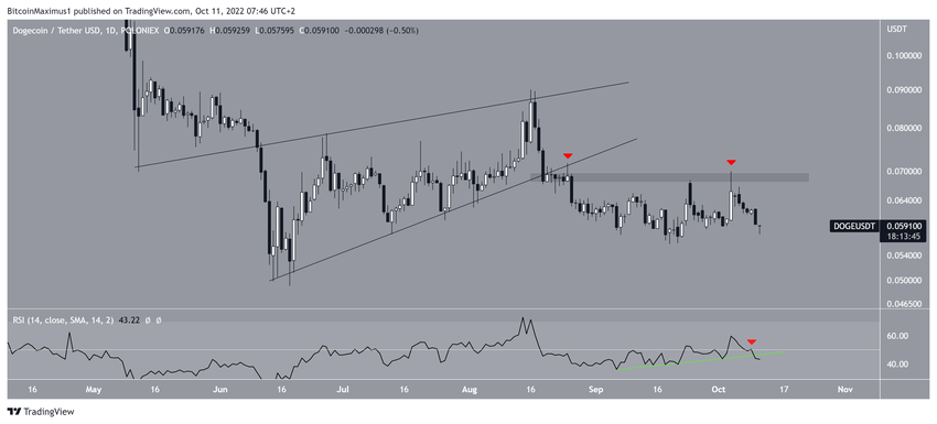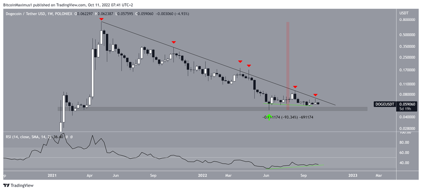 Kurs Dogecoin spada wzdłuż zstępującej linii oporu od momentu osiągnięcia rekordu wszech czasów (ATH) na poziomie 0,073 USD w maju 2021 roku.