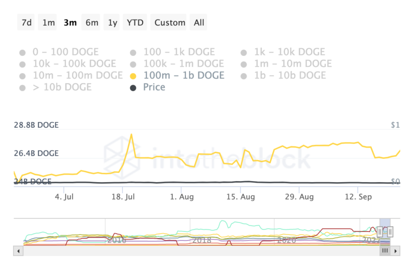 Spojrzenie na HODLers DOGE ukazuje, że liczba adresów posiadających od 100 milionów do 1 miliarda DOGE wzrosła o 5,13% w ciągu ostatniego tygodnia.