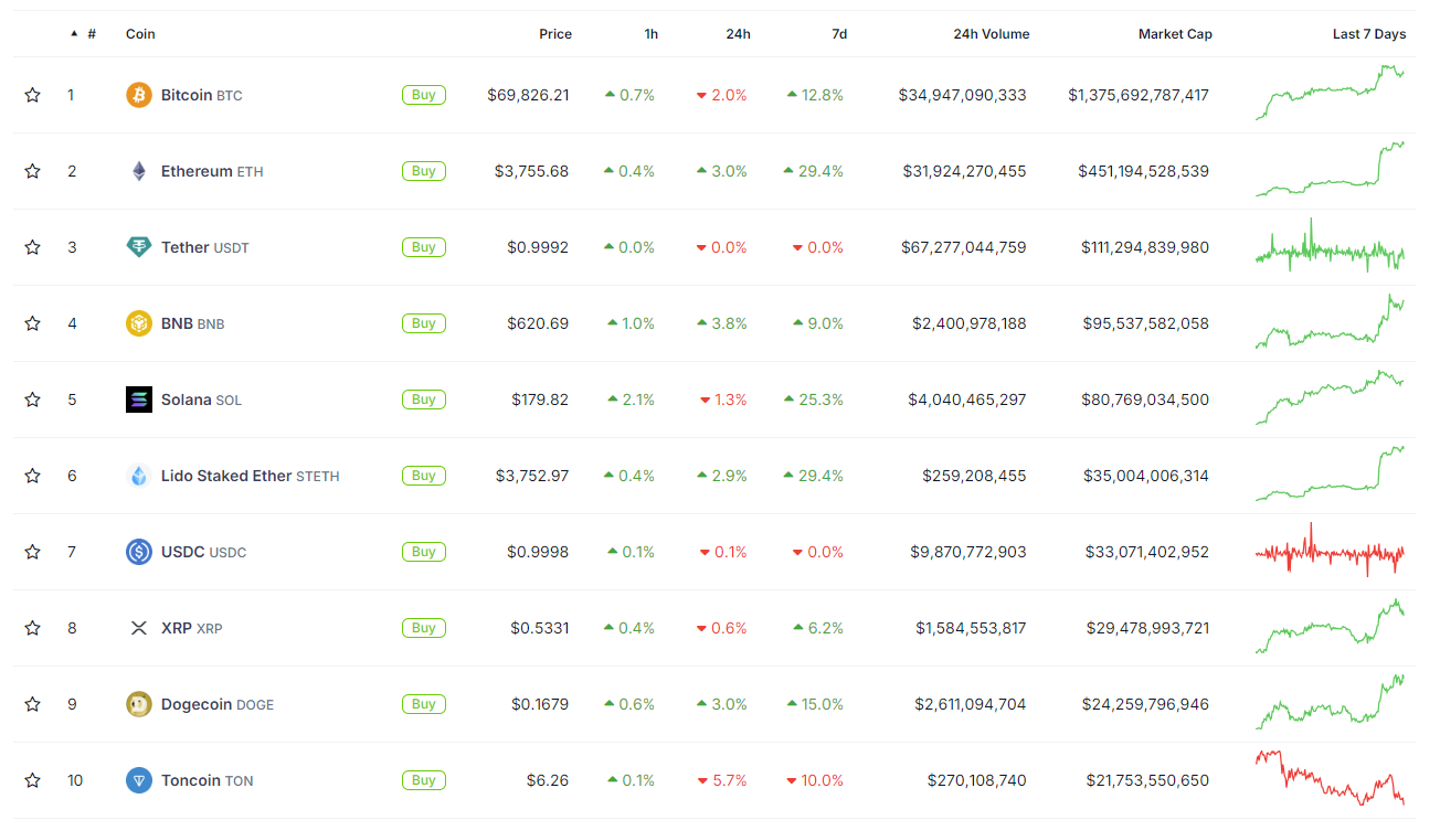 Kursy największych kryptowalut wyglądają następująco. Jak widać, Ethereum okazało się liderem wzrostów wśród gigantów. Wczoraj osiągnęło 24% wzrost, a w perspektywie tygodnia jest to aż 30%.