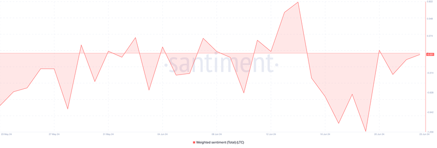 Jednak w przypadku każdego znaczącego wzrostu ceny musi nastąpić zmiana ważonego sentymentu LTC. W chwili pisania tego tekstu wskaźnik ten zwraca wartość -0,021.