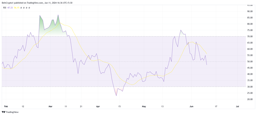 Altcoin wydaje się jednak podatny na dalsze spadki, o czym świadczy wskaźnik siły względnej (RSI). RSI to oscylator momentum, który mierzy prędkość i zmianę ruchów ceny, w zakresie od 0 do 100. Pomaga zidentyfikować warunki wykupienia lub wyprzedania na rynku, wskazując potencjalne punkty odwrócenia.