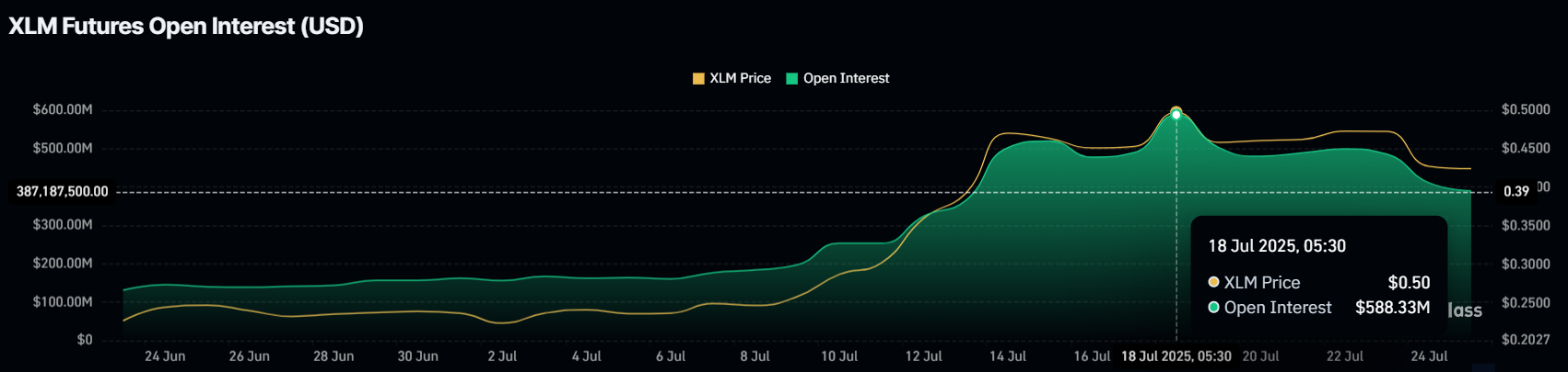 W ciągu ostatniego tygodnia kurs XLM spada, a liczba otwartych pozycji zredukowała się o 33%. Wskazuje na zmianę nastrojów inwestorów. To znaczne zmniejszenie aktywności handlowej wskazuje na brak zaufania do kierunku ceny XLM. Wycofanie 196 mln USD z rynku instrumentów pochodnych pokazuje, że traderzy są niepewni co do kolejnego ruchu altcoina lub wolą czekać na uboczu, zamiast podejmować nowe pozycje.