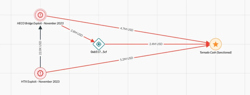 “100 milionów USD zostało skradzionych z giełdy HTX i jej mostu międzyłańcuchowego HECO w listopadzie 2023 r. – Elliptic przypisuje to włamanie grupie Lazarus z Korei Północnej. W ciągu ostatnich kilku dni z tego włamania za pośrednictwem Tornado Cash wyprano ponad 12 mln USD”.