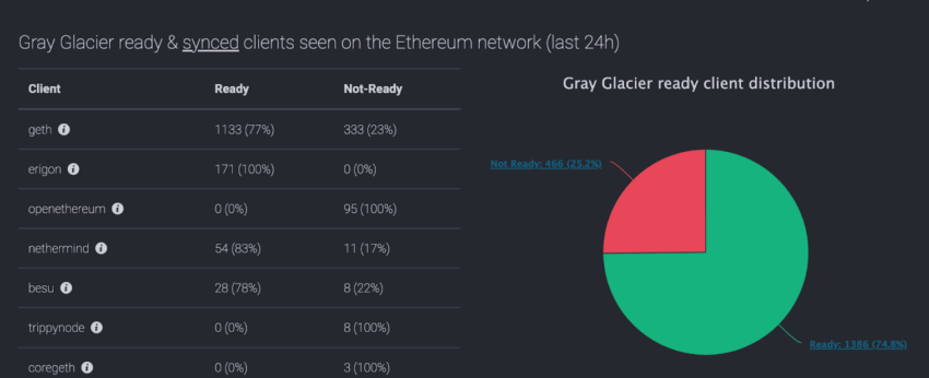 Jednak nie wszyscy górnicy i operatorzy węzłów zastosowali się do tego zalecenia. Kilka godzin po uruchomieniu Gray Glacier, znaczna część klientów Ethereum nie zaktualizowała swojej wersji klienta. Dane Ethernodes pokazują, że tylko 74,8% klientów było gotowych na aktualizację Gray Glacier, po tym jak aktualizacja weszła w życie 30 czerwca.
