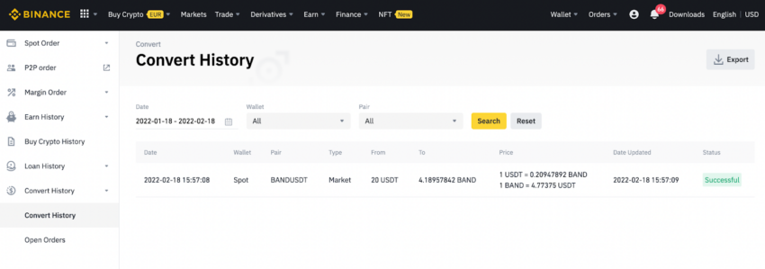 Jeśli jednak nie wiesz, jak ustawić zlecenia na zakup kryptowaluty, najprostszym sposobem na zakup tokena BAND jest konwersja USDT za pomocą opcji Konwertuj w Binance. Przejdź do zakładki Handluj (górne menu) i wybierz opcję Konwertuj.