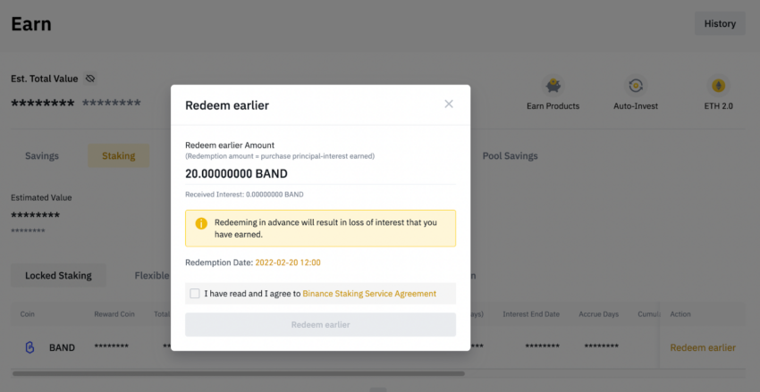 Na Binance możesz stakować tokeny BAND tylko w ramach blokowania środków. Możesz wybrać okres stakingu BAND od 30 do 60 dni. Kliknij na Staking i wpisz liczbę tokenów BAND, które chcesz stakować. Minimalna kwota wynosi 20 BAND.