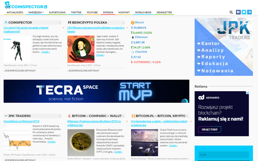 Coinspector to stosunkowo młody na polskim rynku agregator newsów i informacji kryptowalutowych, który zbiera wszystkie Bitcoin wiadomości z najciekawszych polskojęzycznych serwisów kryptowalutowych w czasie rzeczywistym, według daty publikacji, poukładane zgodnie ze źródłem publikacji.