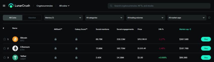 Oto platforma Lunar Crush, która pozwala sprawdzić zaangażowanie społeczne: