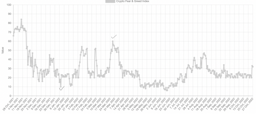 Sponsored SponsoredCrypto Fear and Greed index data (28 Oct. 2021 to 27 Oct. 2022)