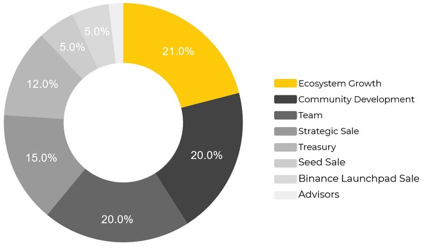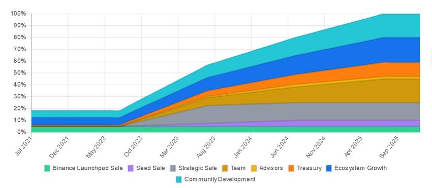 Na przykład, 20% tokenów trafia do zespołu, 2% do doradców, 21% na rozwój ekosystemu, a 20% na rozwój społeczności.