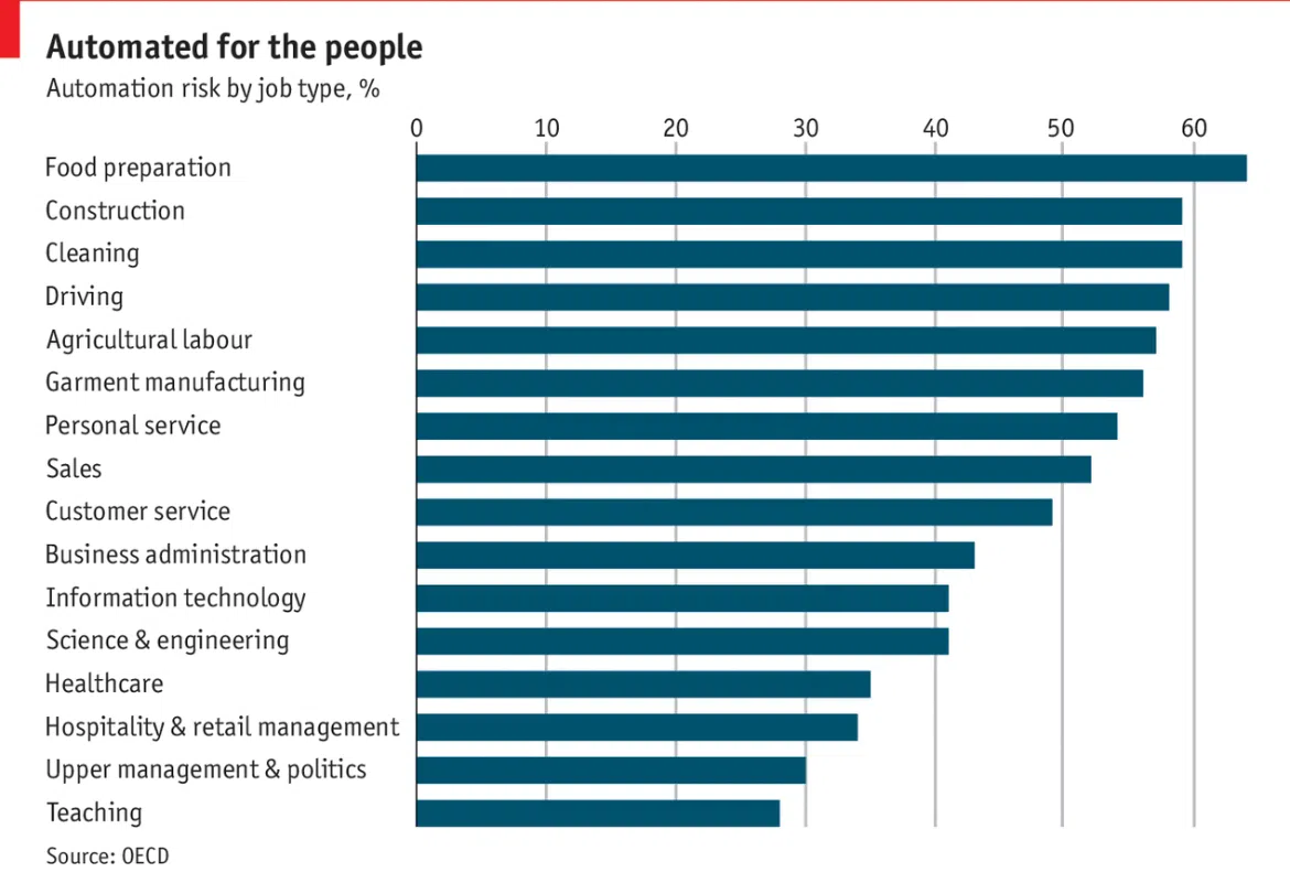 Automatyzacja zadań zagraża zarówno pracownikom fizycznym, jak i umysłowym. Robotyka w coraz większym stopniu przejmuje pracę fizyczną typową dla ról pracowników fizycznych, podczas gdy AI i zaawansowane oprogramowanie zaczynają wykonywać zadania tradycyjnie zarezerwowane dla stanowisk umysłowych.