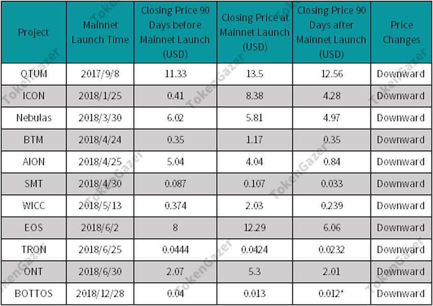 Według badań przeprowadzonych przez agencję badawczą kryptowalut TokenGazer w 2019 roku, z 11 uruchomień mainnetu między wrześniem 2017 a czerwcem 2018 roku, ceny tokenów generalnie wzrosły przed uruchomieniem mainnetu i spadły po nim. Wiele z tego można wyjaśnić szerszym trendem spadkowym na rynku kryptowalut w tym czasie.