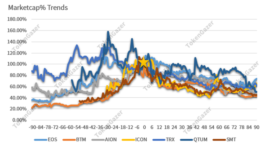 Więc TokenGazer z kolei spojrzał na udział danego tokena w ogólnej kapitalizacji rynku kryptowalut. Odkryli, że dla większości tokenów kapitalizacja rynkowa była najwyższa w momencie uruchomienia mainnetu. Oznacza to, że kapitalizacja rynkowa wzrosła w okresie poprzedzającym uruchomienie, a następnie spadła.