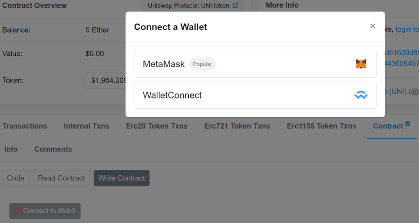 Zagłębiając się jeszcze bardziej, jeśli przejdziesz do zakładki “Contract”, możesz dowiedzieć się jak wygląda kod kontraktu. Ponadto, kontrakt jest bezpośrednio dostępny w zakładce ‘Connect to Web3’ pod polem ‘Write Contract’, jeśli masz zainstalowany jeden z portfeli w formie rozszerzenia dla przeglądarki internetowej.