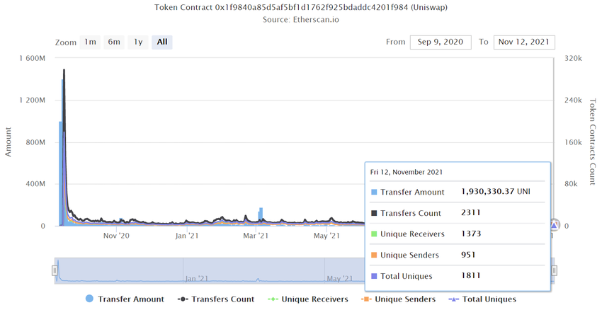Następnie, klikając na sam kontrakt, przechodzimy do pełnej listy wszystkich transferów obsługiwanych przez Uniswap, w tym transakcji DEX. Z tego miejsca możemy również przejść do zakładki “analytics”, aby ujrzeć wszystkie istotne dane na temat kontraktu tokenowego Uniswap: