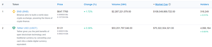 Jeśli szukasz jednego z tysięcy altcoinów/tokenów ERC-20, Etherscan jest najlepszym narzędziem do tego zadania. W rzeczywistości, używając tej platformy, uzyskasz najbardziej dokładny przegląd ekosystemu Ethereum. Dzięki niemu możesz zobaczyć jak popularny jest dany token, ilu ma posiadaczy, jego kapitalizację rynkową i wolumen obrotu.