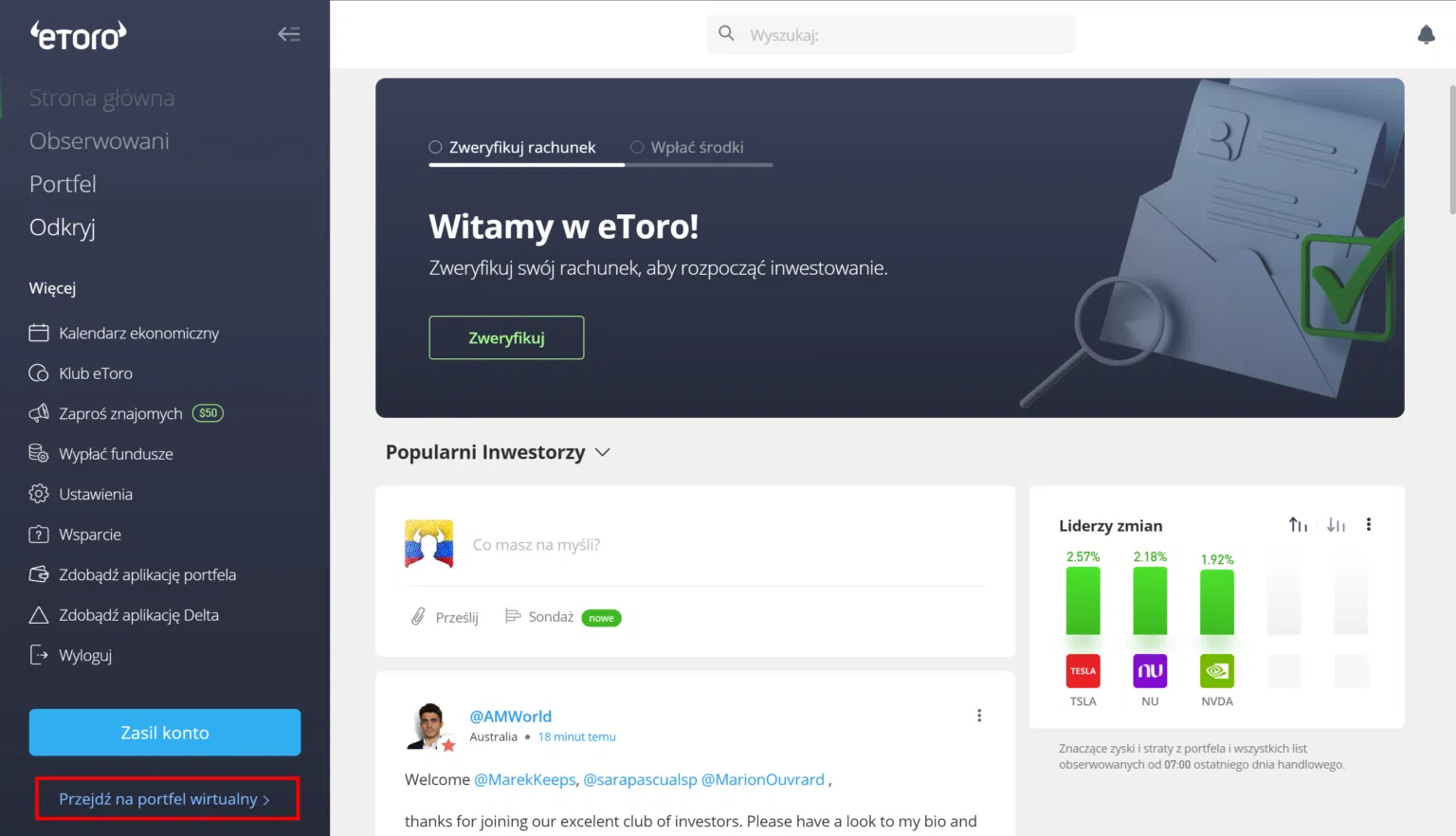 eToro oferuje także ciekawy sposób na naukę tradingu, a mianowicie konto demo. Dzięki niemu możesz dokonywać transakcje za pomocą wirtualnych środków, a tym samym testować swoje strategie. Jak więc, otworzyć konto demo eToro? Wystarczy, że po lewej na dole klikniesz “Przejdź na portfel wirtualny”. To tyle! Od razu zostaniesz przeniesiony na konto demo eToro, które zostanie doładowalne wirtualnymi 10 000 USD!