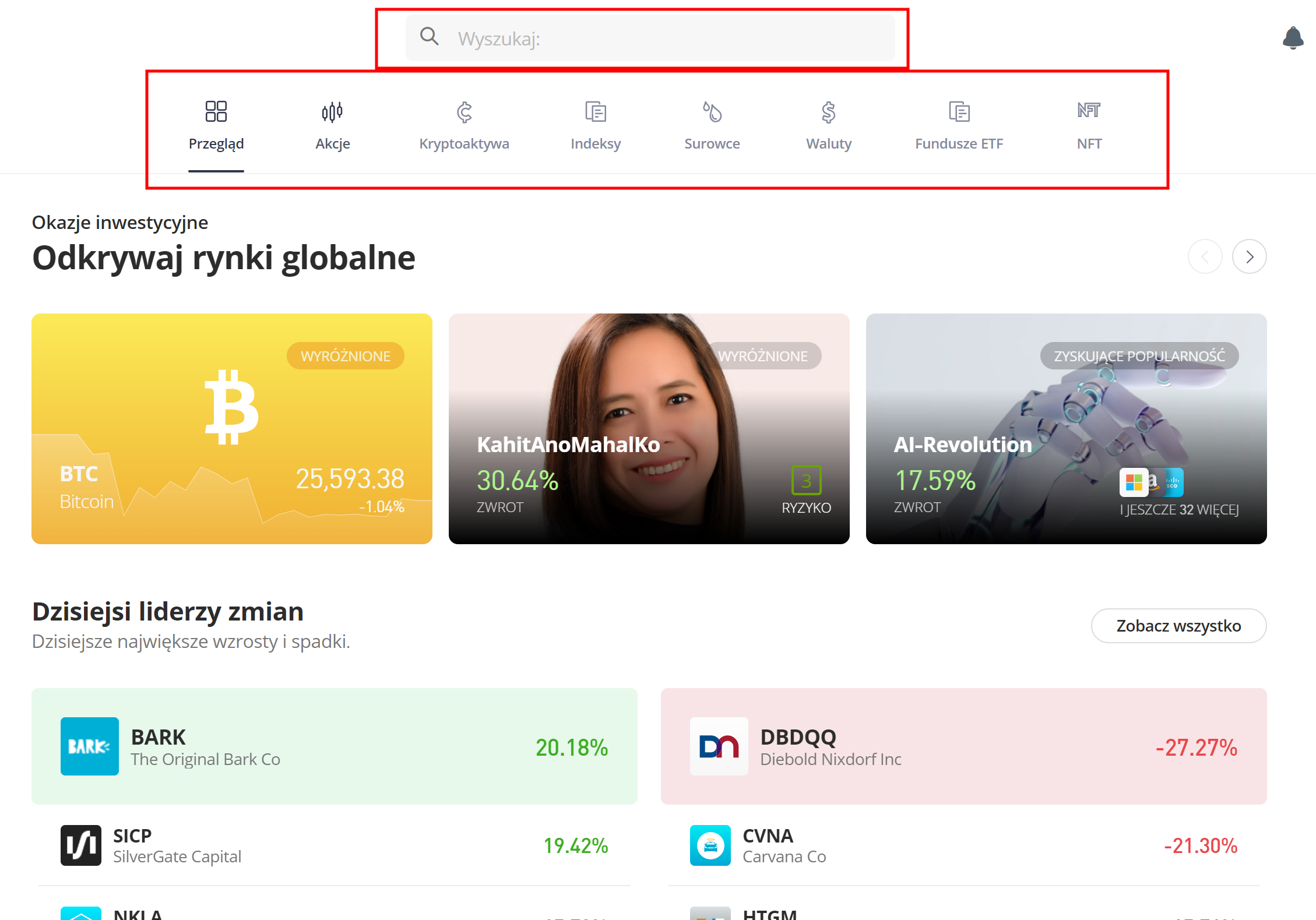 Teraz możesz wybrać rodzaj aktywów, w które chcesz zainwestować i wyszukać odpowiednie ręcznie lub po prostu skorzystać z wyszukiwarki umieszczonej w górnej części strony.