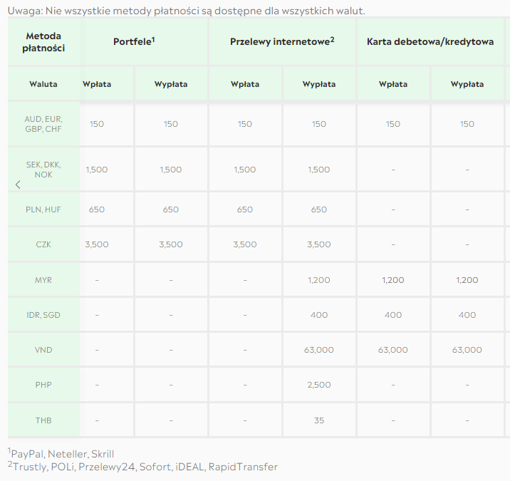 Dla Polskich użytkowników najważniejsze będą jednak opłaty i prowizje za przewalutowanie. Zwłaszcza dla tych, którzy nie mają możliwości bezpośredniej wpłaty w USD. Wszelkie koszta z tym związane przedstawia poniższa tabela (wartości podane są w pipsach).