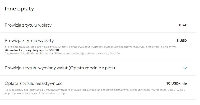 Opłaty i prowizje eToro są naliczane również w przypadku pozostawienia otwartej pozycji przez noc, przez weekend lub w przypadku 12 miesięcy bez zalogowania się na konto. 5 USD zapłacimy też za wypłatę.
