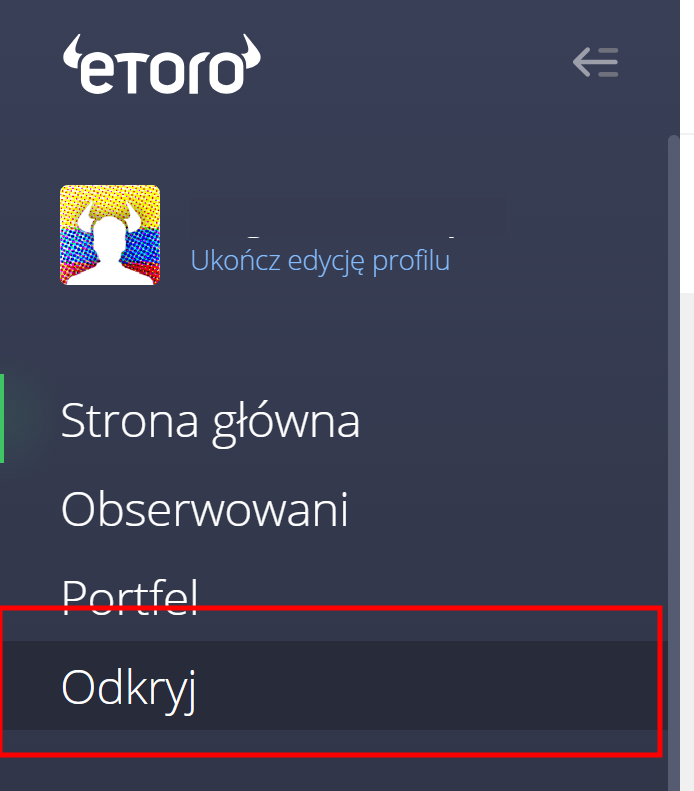 Jak wspomnieliśmy na początku tego artykułu, eToro pozwala inwestować w naprawdę wiele różnych intrumentów finansowych, od akcji, przez towary, a na kryptowalutach kończąc. Aby rozpocząć inwestycję, kliknij “Odkryj” po lewej stronie stronie.