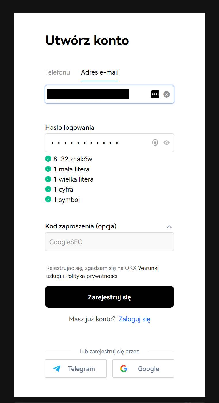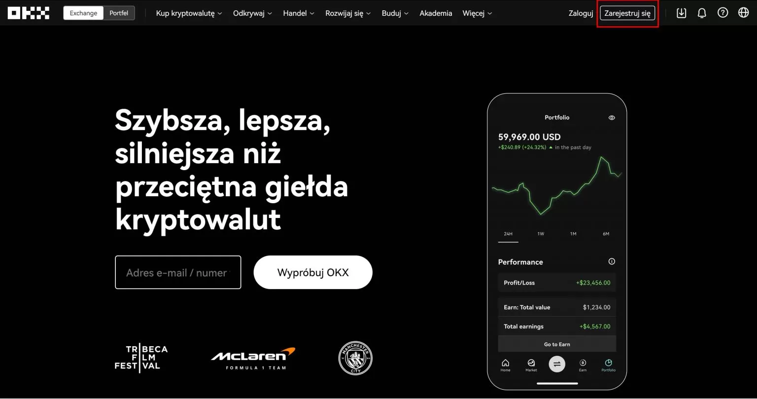 Krok 1: Jeśli nie masz jeszcze konta, wejdź na dostępną w naszym języku stronę www.okx.com/pl i w prawym górnym rogu wybierz przycisk “Zarejestruj się”.