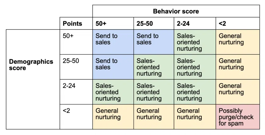 Lead scoring obejmuje ocenę różnych czynników, takich jak informacje demograficzne, zachowanie i zaangażowanie leada w Twoją markę. Na przykład, potencjalny klient, który odwiedził Twoją witrynę wiele razy, pobrał oficjalny dokument i wziął udział w webinarium, może otrzymać wyższą ocenę niż potencjalny klient, który odwiedził Twoją witrynę tylko raz.
