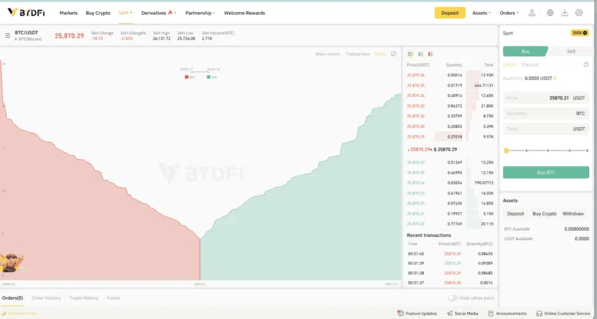 Po wejściu na BYDFi możesz natychmiast rozpocząć handel kryptowalutami, deponując swoje kryptowaluty. Na tym etapie nie ma wymogu ukończenia weryfikacji KYC; musisz jedynie uiścić opłaty transakcyjne specyficzne dla sieci.