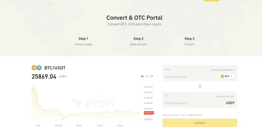 Trzeci poziom “Convert” jest całkiem inny, uproszczony. Jest to bardziej pozagiełdowy konwerter Crypto na USDT, przeznaczony dla użytkowników, którzy nie chcą wychodzić całkiem z rynku krypto, ale chcą konwertować swoje środki na stablecoiny.