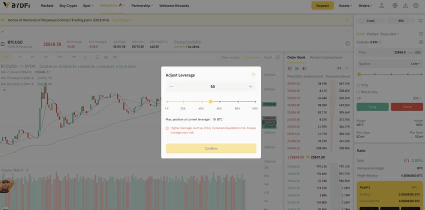 W BYDFi handel tymi tzw. perpami jest możliwy, w tym także z dźwignią do 100x. Zaleca się jednak utrzymywanie dźwigni na niższym poziomie, aby zminimalizować ryzyko likwidacji i straty kapitału.