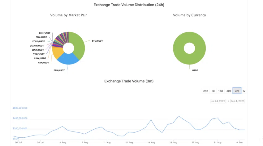 Jeśli chodzi o płynność, CEX należy do tej samej kategorii, co Gate.io i KuCoin. Ponadto, jeśli spojrzeć na wolumen obrotu specyficzny dla giełdy od czerwca 2023 sytuacja BYDFi była stabilna, z pewnym spadkiem obserwowanym w połowie sierpnia.