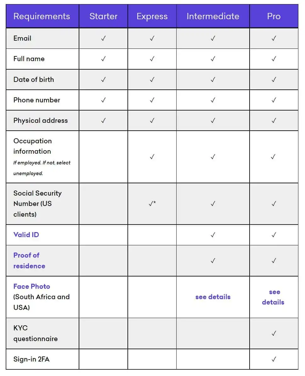 Spójrz na poniższą tabelę z oficjalnej strony Kraken. Przedstawia ona wymagania na poszczególne poziomy weryfikacji: