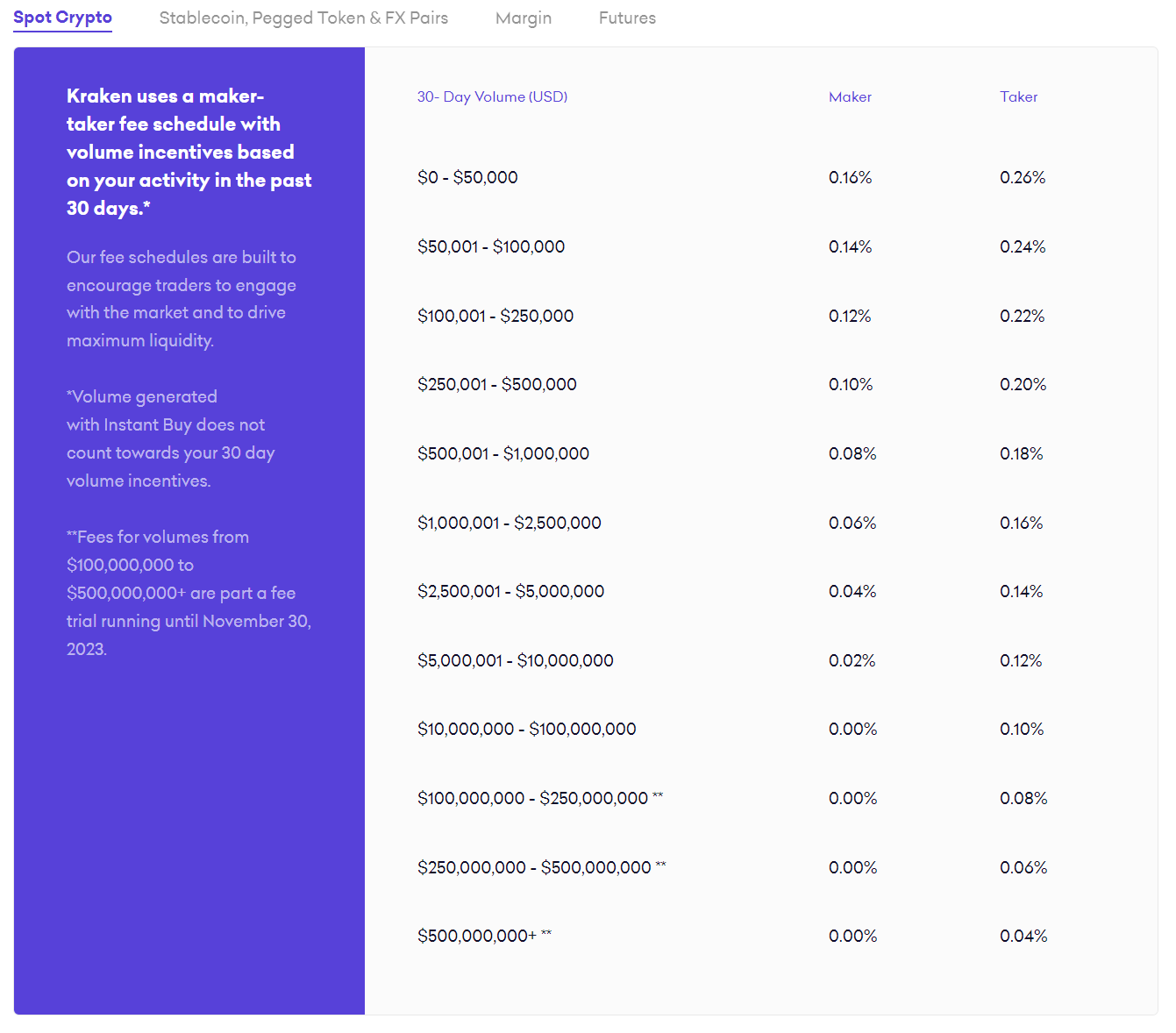 - Prowizje typu taker: Dotyczą sytuacji, gdy klient realizuje istniejącą ofertę innego użytkownika. Początkowa prowizja wynosi 0,20%, ale może spaść do 0% dla użytkowników z miesięcznym wolumenem przekraczającym 1 mln USD.
