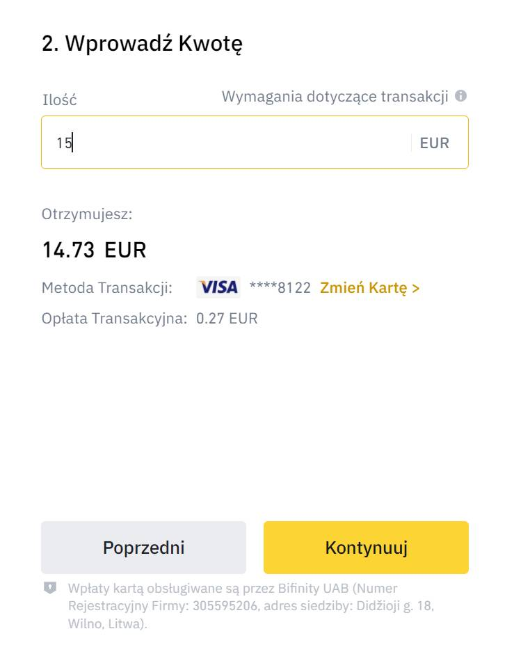 Jeżeli wybrałeś opcję karty, proces wygląda jak podczas robienia jakichkolwiek innych zakupów w internecie. Po jej dodaniu wystarczy, że wpiszemy odpowiednią kwotę, którą chcemy wpłacić i klikniemy Kontynnnuj