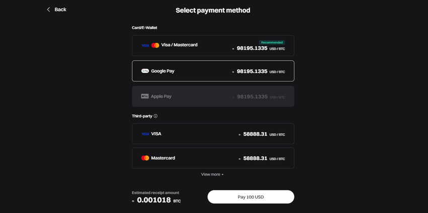 Krok 3) Bitget oferuje wiele opcji zakupu, w tym szybki zakup, zakup za pomocą karty kredytowej/debetowej i handel P2P. Procedury dla pierwszych dwóch są zasadniczo takie same – jedyną różnicą jest to, że opcja “szybkiego zakupu” daje dodatkowe metody płatności do wyboru, takie jak Apple Pay i Google Pay.