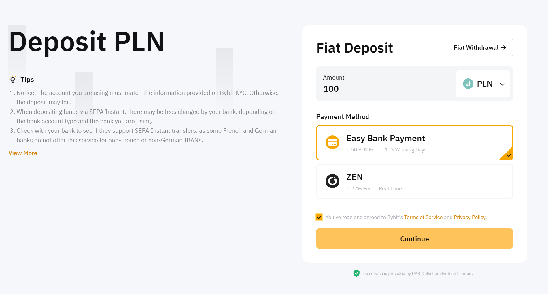 Przejdź do zakładki One-By-Click, a następnie kliknij Fiat Deposit. Wpisz kwotę depozytu w PLN. Wybierz także metodę płatności Easy Bank Payment, zaakceptuj warunki i kliknij Continue.