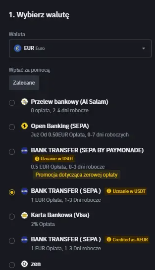 Krok 5: Ustal sumę do wpłacenia. Na platformie Binance nie ma możliwości bezpośredniego wpłacania złotych, jednak dostępne jest wpłacanie euro. Dla chcących wpłacić PLN, rozwiązaniem może być użycie aplikacji ZEN.