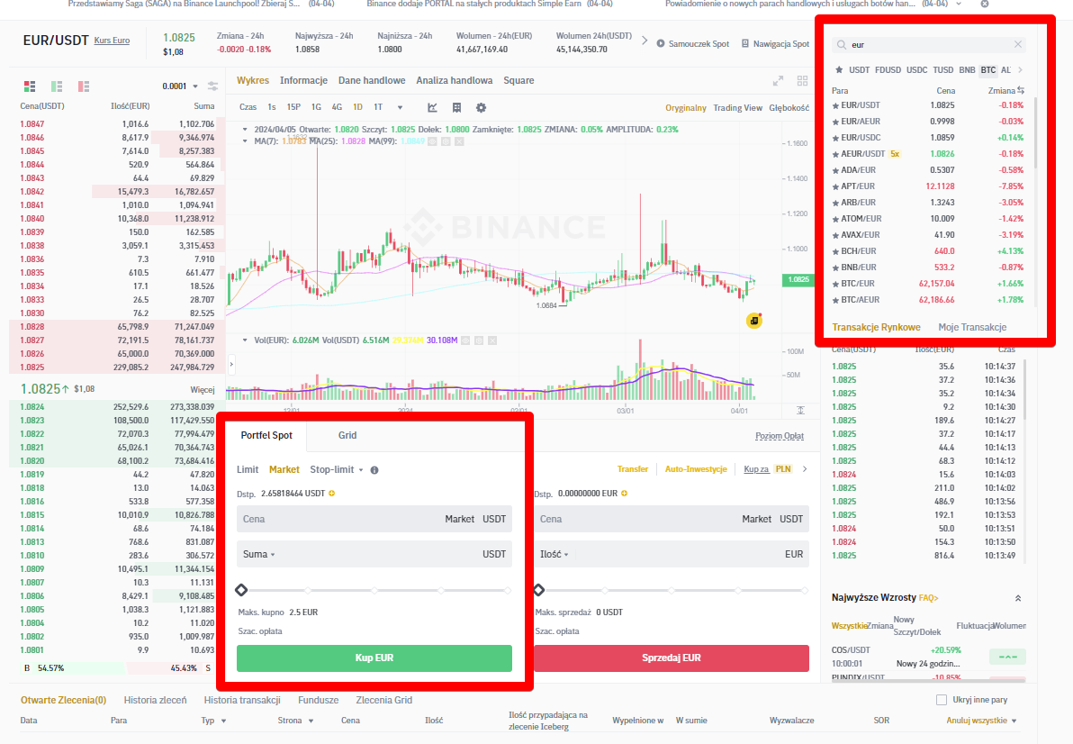 Następnie wybieramy po prawej stronie odpowiednią parę walutową (w naszym wypadku do euro), wybieramy rodzaj zlecenia po środku ekranu na dole, wpisujemy kwotę i klikamy Kup. Krypto zakupione w ten sposób od razu pojawi się w naszym portfelu.