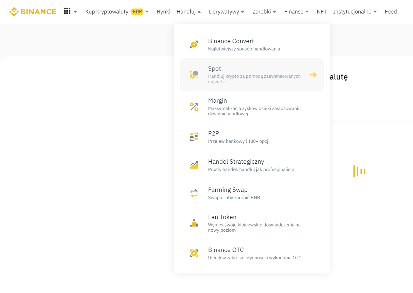 W tym celu najedź myszką u góry na “Handluj”, a następnie kliknij “Spot”.