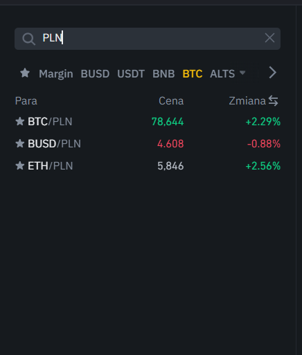 Po prawej stronie znajdź wyszukiwarkę i wpisz w niej PLN. Wyświetlą Ci się wszystkie pary w stosunku do naszej lokalnej waluty. Kliknij jedną z nich.