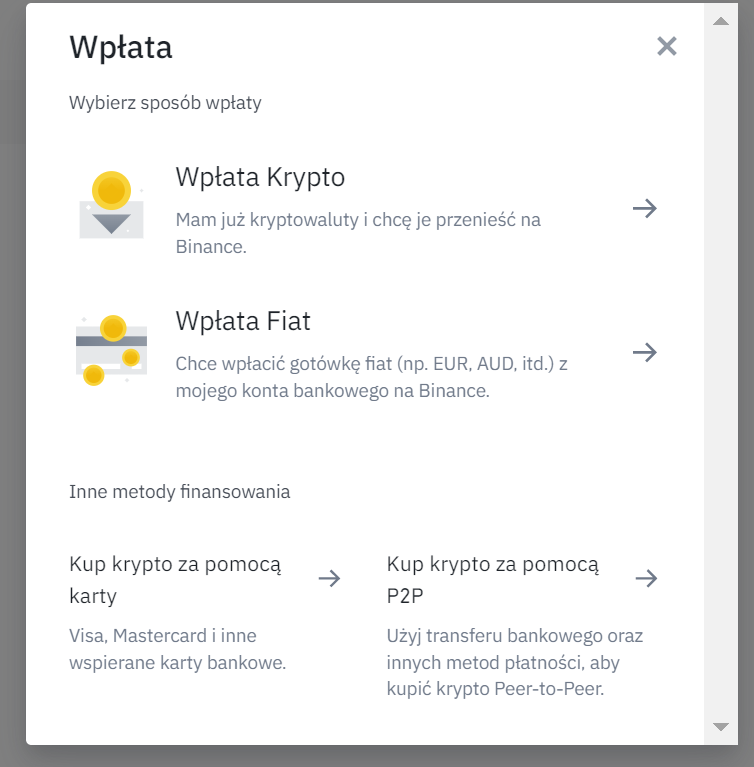 Oczywiście, aby wpłacić pieniądze na Binance, najpierw musisz posiadać tam konto. Aby się zarejestrować wystarczy, że klikniesz tutaj i będziesz postępował według klasycznego modelu zakładania konta. Musisz wypełnić wszystkie niezbędne dane i kliknąć w link, który otrzymasz emailem. Pamiętaj też, że aby handlować na Binance, Twoje konto musi być zweryfikowane! Jeżeli masz już konto, po prostu się na nie zaloguj, przejdź do swojego portfela, kliknij “Wpłata”, a następnie “Wpłata fiat”.