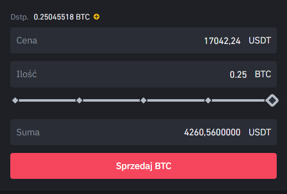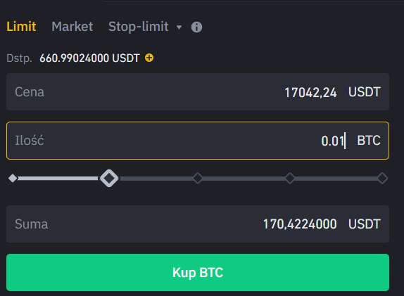 Teraz na dole po środku ekranu będziesz musiał złożyć zlecenie. Binance pozwala na otwieranie pozycji przy pomocy różnych zleceń: