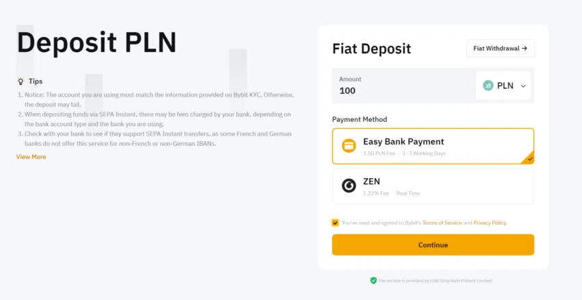 Wybierz opcję Fiat Deposit, następnie ustaw walutę jako PLN, wybierz metodę płatności i kliknij Continue.