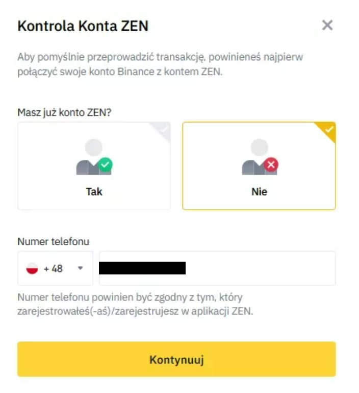 Binance zapyta Cię czy posiadasz już konto ZEN. Jeżeli posiadasz sprawa jest o wiele prostsza. Jeżeli nie, będziesz musiał takowe założyć. Wybierz odpowiednią opcję, wpisz swój numer telefonu i naciśnij “Kontynuuj”.