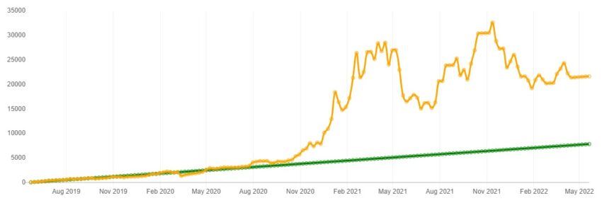 Kontynuując powyższy przykład, załóżmy, że trzy lata temu zacząłeś kupować co tydzień Bitcoiny o wartości 50 złotych. W ciągu tych trzech lat zainwestowałbyś w BTC 7 850 złotych. Teraz, używając kalkulatora DCA, przekonasz się, że całkowita wartość Twojej inwestycji wynosi obecnie 21 777 złotych. To spory zysk, wynoszący 177,42% w ciągu trzech lat.
